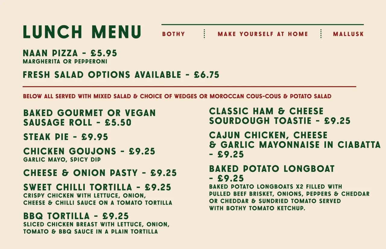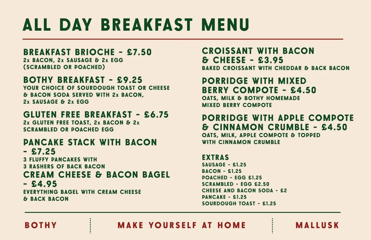 BothyMallusk 10 Central Park | Mallusk | BT36 4FSTell: 02890 841096Open Monday - Saturday 9am - 4pm breakfast served9am-3.30pm lunch served9am-3.30pm